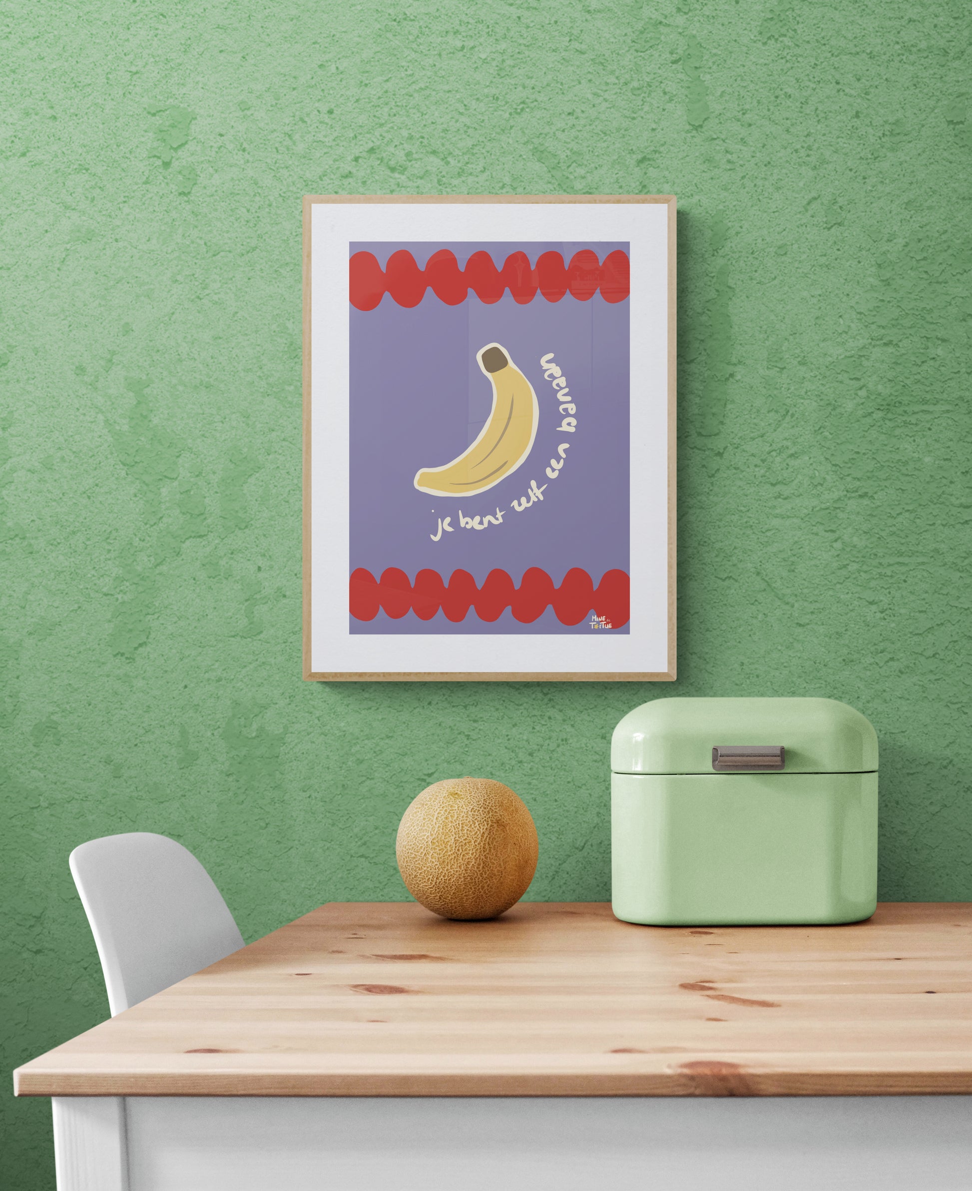‘Je bent zelf een banaan’ is playful and a little bit bold. Don’t take life too seriously. It’s the kind of poster that catches your eye and makes you grin. It works really well in kitchens, dining areas, creative spaces, and rooms where you like a bit of humour on the wall and don’t mind a small conversation starter.