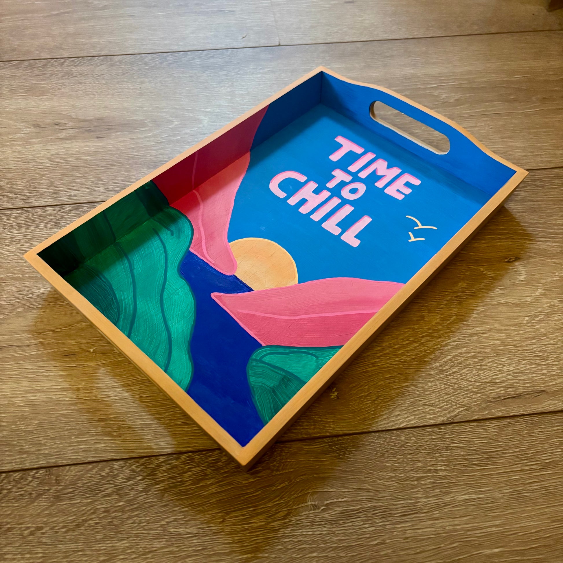 Een IKEA bamboe dienblad, met de hand beschilderd en een duidelijke boodschap: doe even rustig aan.