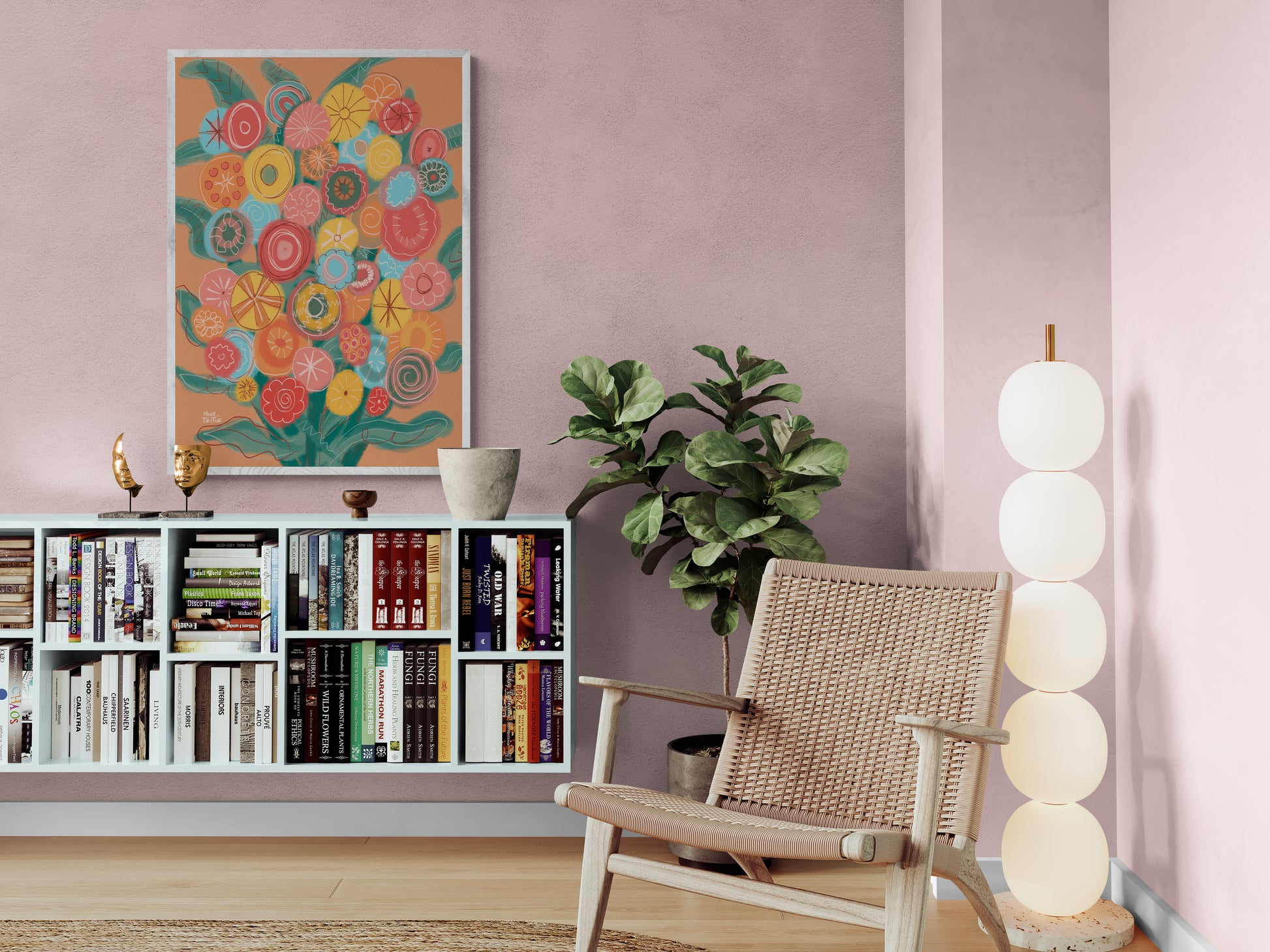 De warme terracotta achtergrond laat de bloemen extra knallen. Geel, roze, turquoise, oranje.. alles werkt samen. Deze poster brengt energie in je woonkamer, keuken of werkruimte. Perfect als statement piece boven een bank of als kleurrijke toevoeging aan een gallery wall.