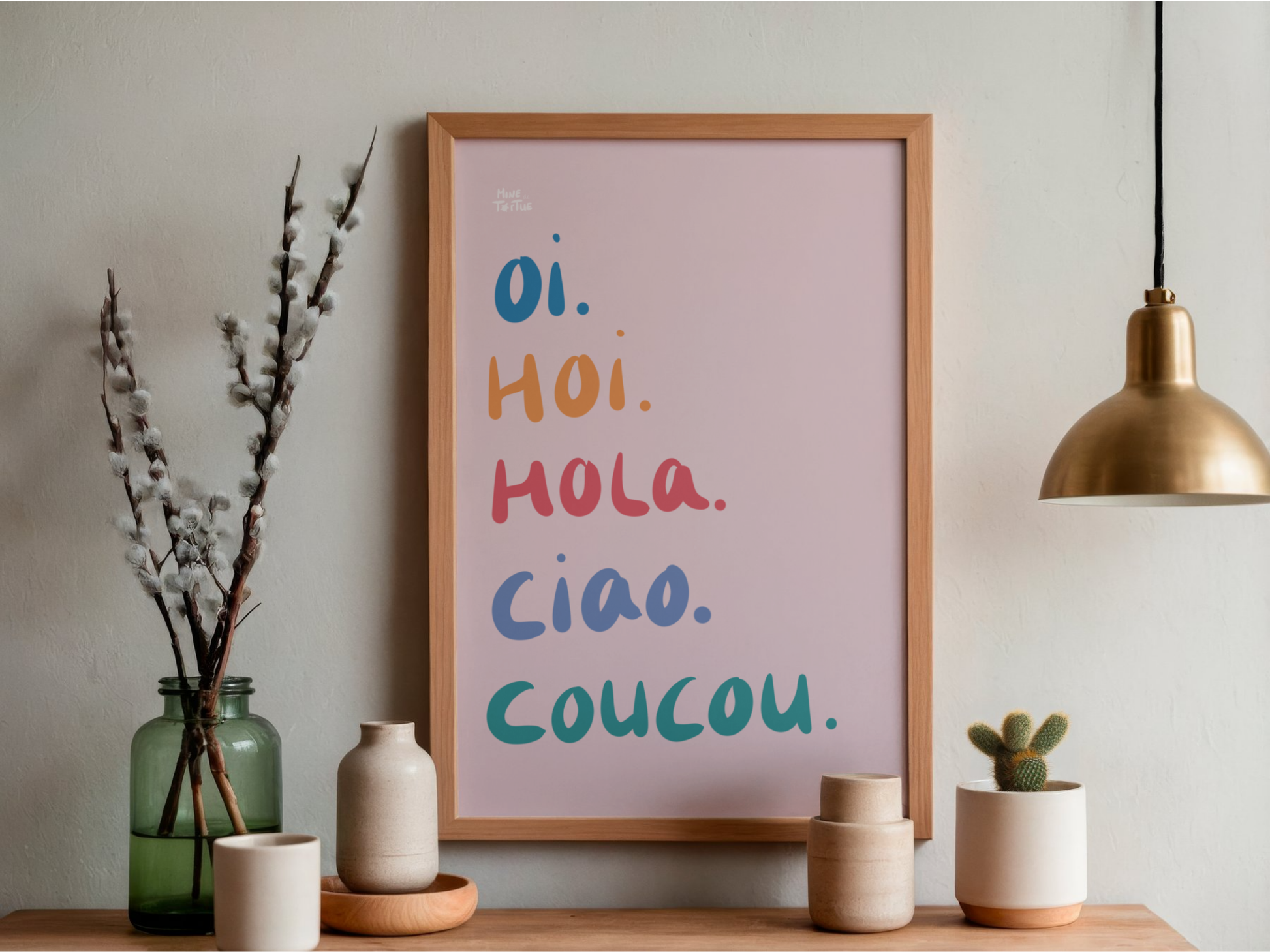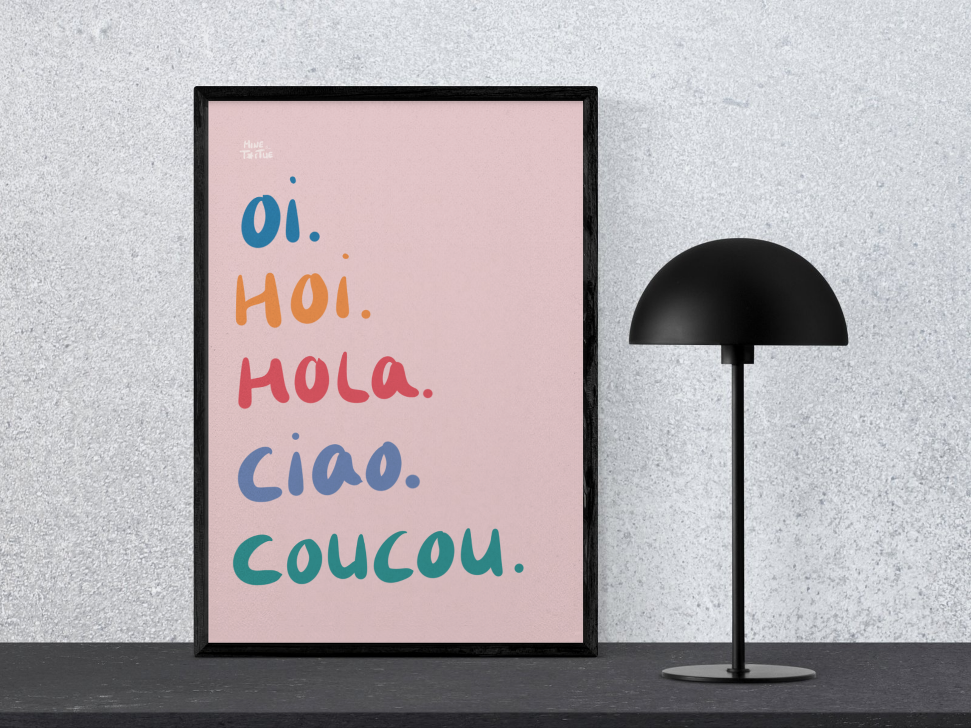 Deze tekstposter zegt gewoon even hallo. In meerdere talen. “Oi. Hoi. Hola. Ciao. Coucou.”